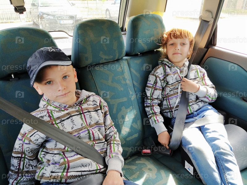 Дети в машине. На заднем сиденье сидят мальчик и девочка, смеются и гримасничают. Дети пристегивают ремни безопасности. Ребенок в кепке. Дети - разнолицые близнецы, одетые в одинаковую одежду
