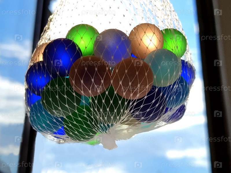 Разноцветные кликеры или шарики из матового стекла для украшения. Синие, зеленые, синие, бежевые шарики подвешены в сетке в воздухе на фоне окна и неба. Тактильные игрушки. Свет солнца сияет сквозь цветное стекло