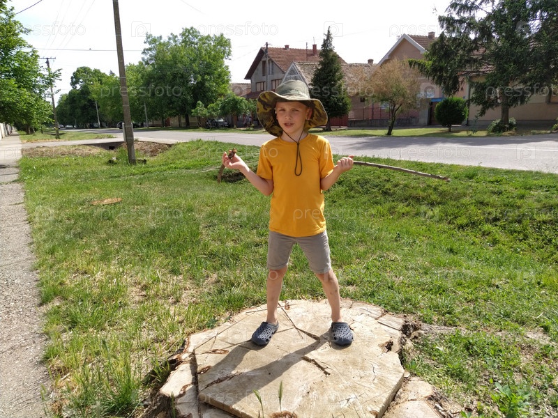 Мальчик в желтой футболке и охотничьей шапке стоит на широком пне от большой липы. Одной рукой ребенок держит палку, а другой держит шапку. Сельская местность Сербии в солнечную погоду