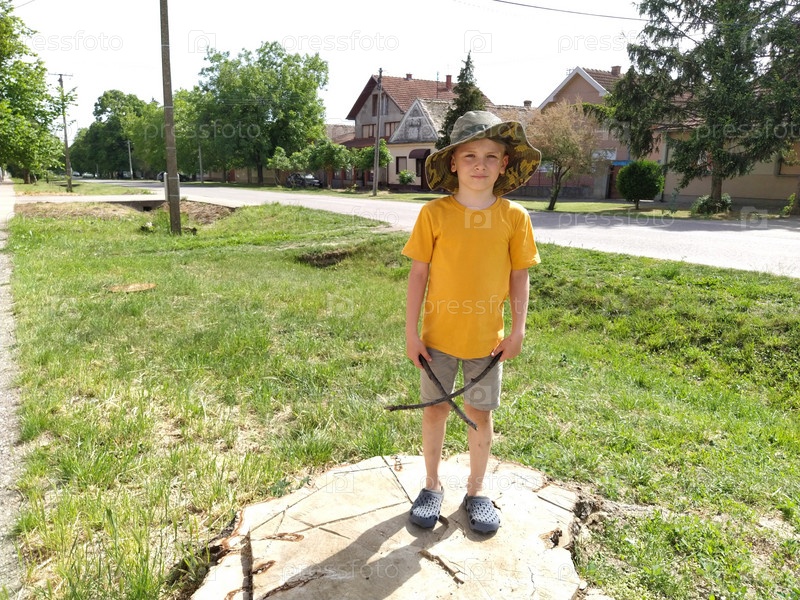 Мальчик в желтой футболке и охотничьей шапке стоит на широком пне от большой липы. Одной рукой ребенок держит палку, а другой держит шапку. Сельская местность Сербии в солнечную погоду