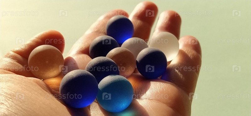 Стеклянные шарики разных цветов лежат на руке женщины. Боковое освещение