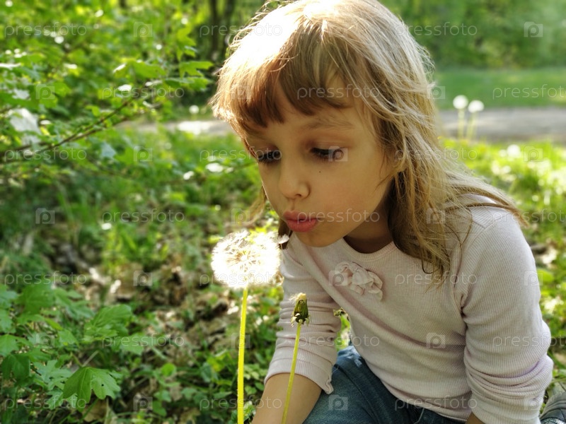 Хорошенькая девочка набирает воздух в грудь и сдувает белые пушистые семена одуванчика. Ребенок со светлыми волосами одет в белую блузку. Полевые цветы на лугу. Игры в летнем лесу