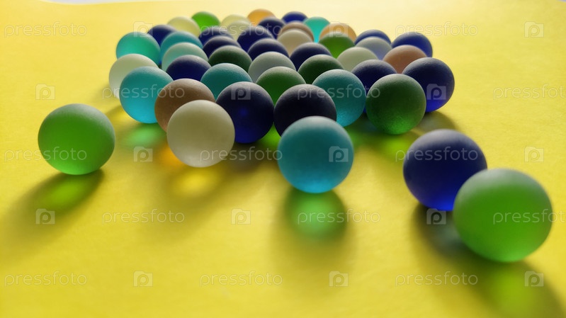 Стеклянные шарики разных цветов лежат на желтой поверхности. 2 мяча против всех остальных