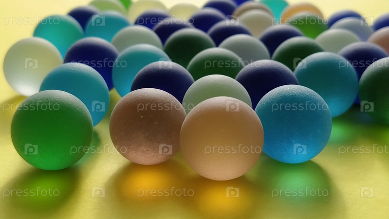 Синие и зеленые стеклянные матовые шарики на желтой поверхности. Частично расфокусирован. Тактильная игра или элемент декора квартиры
