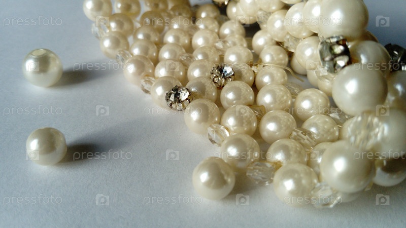 Жемчужные украшения на белом фоне. Браслет ручной работы с россыпью бусин. Красивые бусы нежного цвета шампанского. Женственное украшение