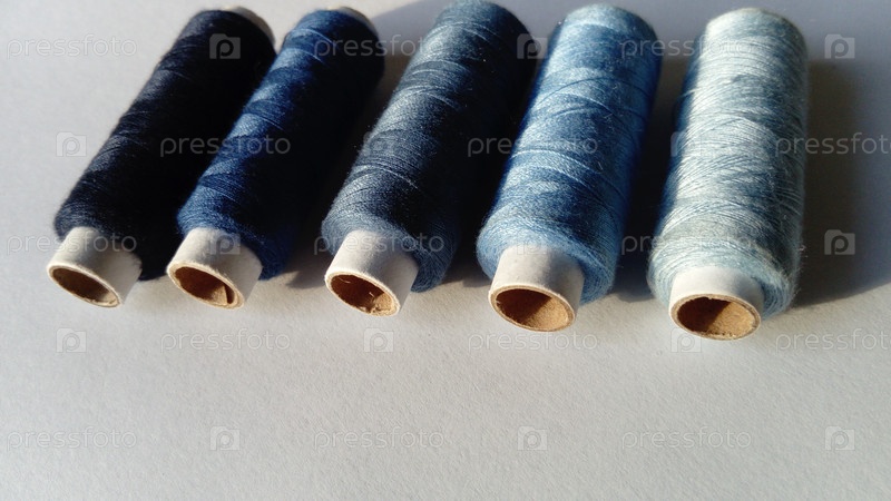 Синие хлопковые нитки. Катушки ниток на белой поверхности. Материалы для пошива одежды, штор и обивки