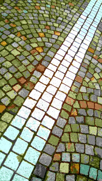 Иллюстративное изображение каменной мостовой в старом городе. Осенние цвета - желтый, зеленый, синий, красный, коричневый