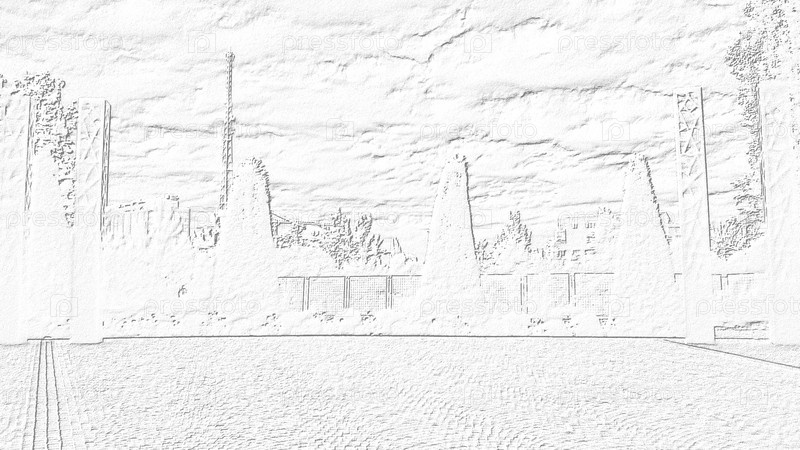 Городской парк с тротуаром и деревьями. Контрастный серый рисунок на белом фоне