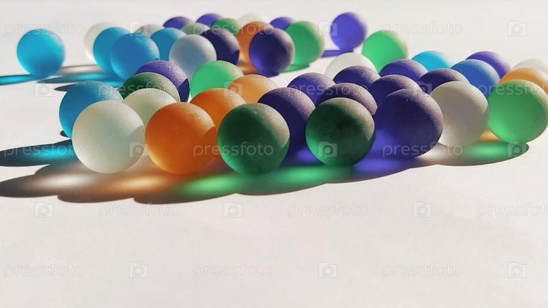 Игровые кликеры или цветные стеклянные шарики, разбросанные по белому фону. заднее освещение