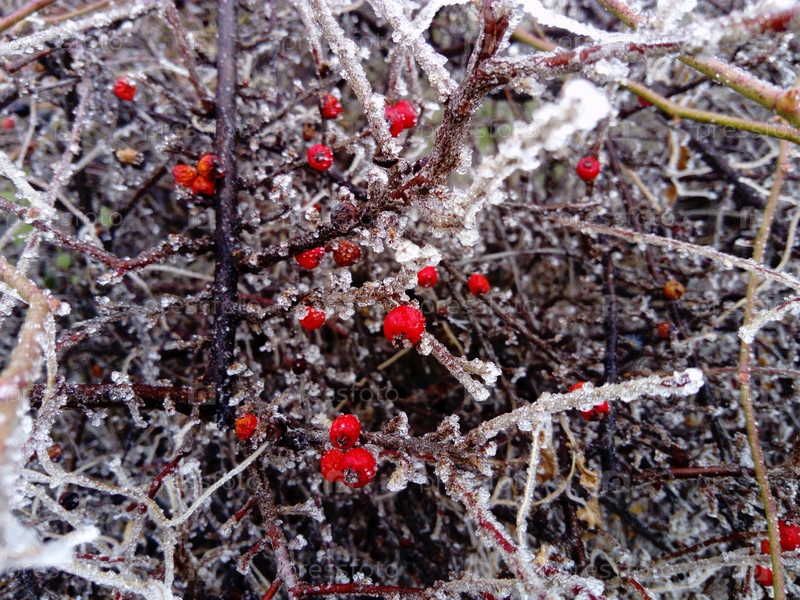 Крупный план замороженных красных ягод на кусте. Иней приковал растение зимой. Яркие фрукты под снегом. Кристаллы льда образуются из-за повышенной влажности. Неожиданный мороз. Ягоды похожие на рябину