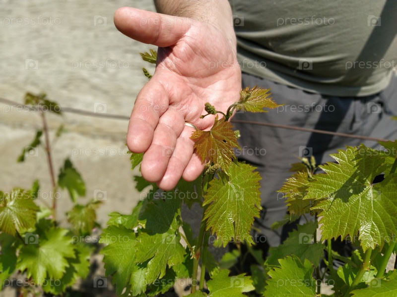 Крупный план рук виноторговца или виноградаря, осматривающего урожай винограда. Мужские руки и виноградная лоза. Молодые побеги винограда с соцветиями и небольшими завязями винограда. Будущий урожай вина