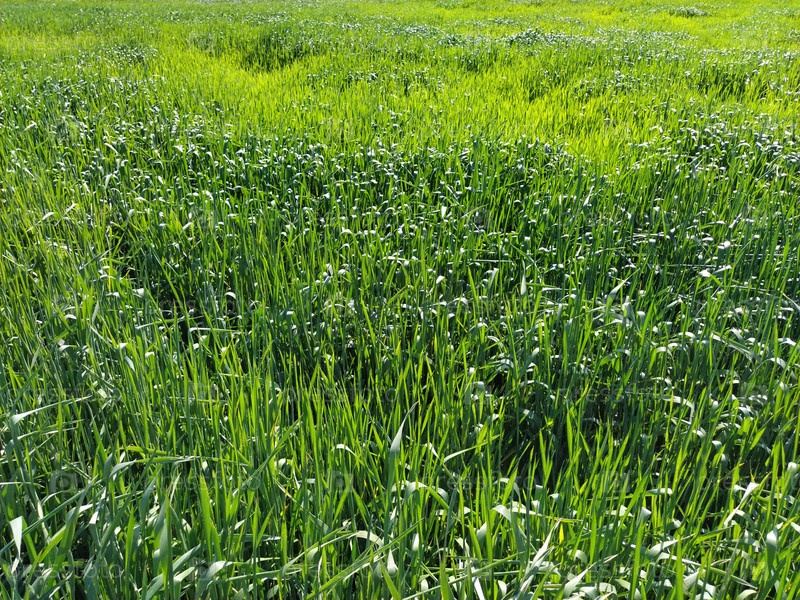 Пшеничное поле крупным планом. Летом зеленая высокая трава колышется и качается на ветру. Насыщенный зеленый цвет