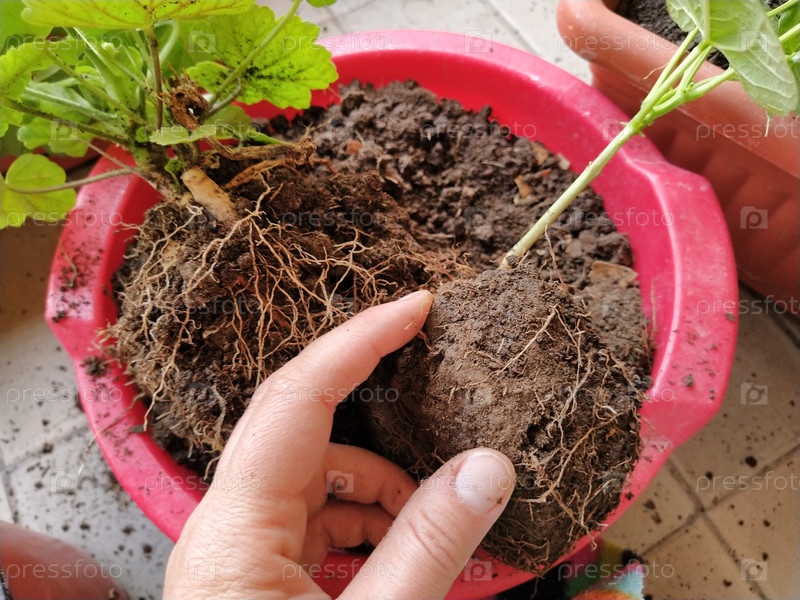 Пересадка герани в домашних условиях. Женские руки работают с почвой, инструментами и цветочными горшками. Весенние работы на балконе или террасе. Домашнее цветоводство и растениеводство. Зеленые листья и корни пеларгонии