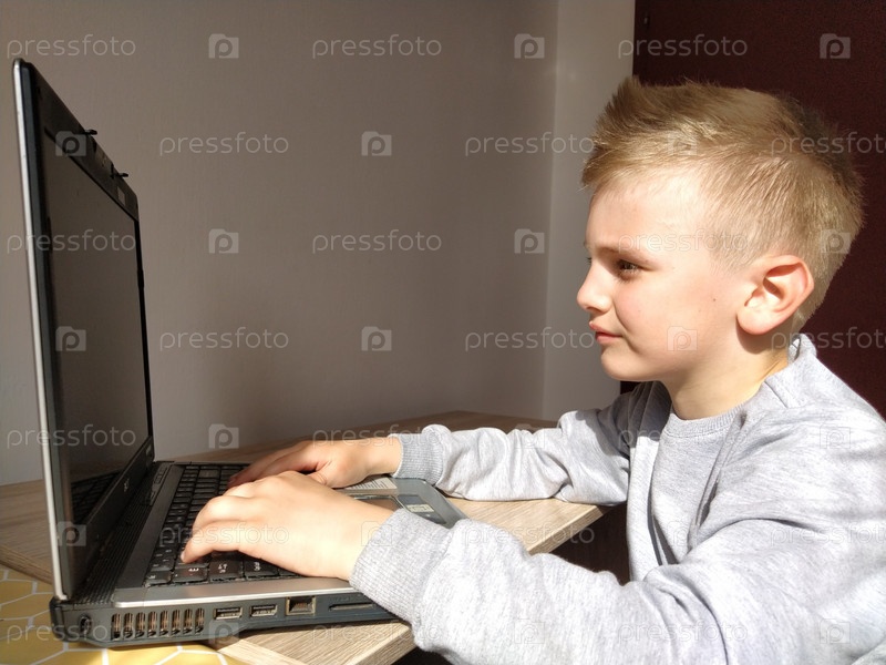 Сремска-Митровица, Сербия, 20 мая 2020 г. Блондин с ноутбуком. Ребенок смотрит на монитор. Задумчивость на лице