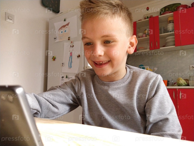 Сремска-Митровица, Сербия, 20 мая 2020 г. Блондин с ноутбуком. Ребенок смотрит на монитор. Эмоция радости