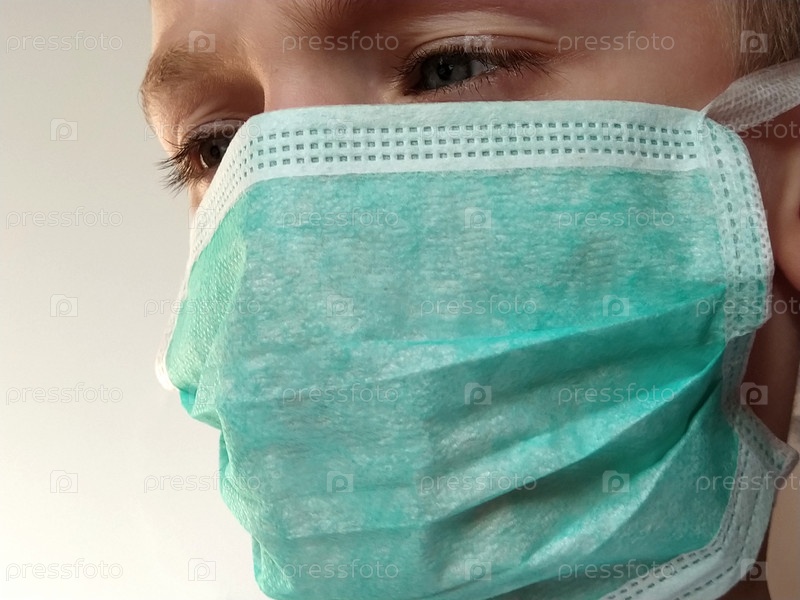 Ребенок в маске. Лицо 7-летнего мальчика в защитной хирургической маске крупным планом. Школьник со светлыми волосами и серо-голубыми глазами на белом фоне