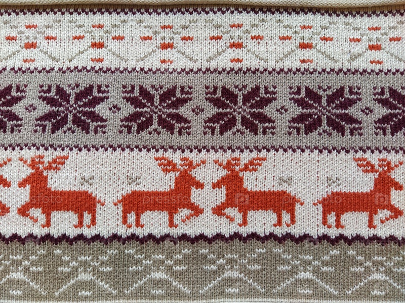 Вязаные узоры со снежинками, оленями, цветами, ломаными полосками. Оранжевые, красно-коричневые, белые, бежевые шерстяные нитки. Народное искусство. Теплый зимний свитер связан лицевыми петлями. Новый год и Рождество