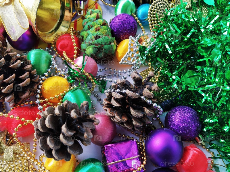 Коллекция рождественских украшений. Красиво расставленные блестящие яркие елочные украшения, зеленая фольга, подарки. Красные, фиолетовые, желтые красочные элементы декора на Новый год и Рождество