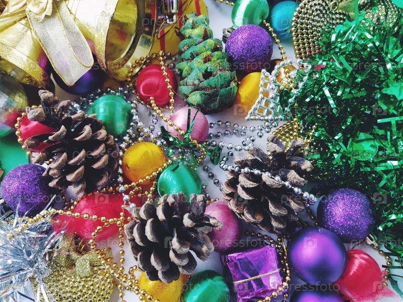 Коллекция рождественских украшений. Красиво расставленные блестящие яркие елочные украшения, зеленая фольга, подарки. Красные, фиолетовые, желтые красочные элементы декора на Новый год и Рождество