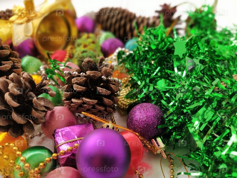 Коллекция рождественских украшений. Красиво расставленные блестящие яркие елочные украшения, зеленая фольга, подарки. Красные, фиолетовые, желтые красочные элементы декора на Новый год и Рождество