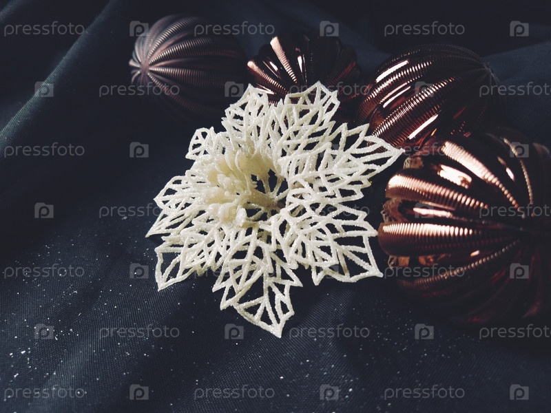 Открытка на новый год и рождество с украшениями, рождественскими украшениями и блестками на черном фоне. Коричневые блестящие полосатые шарики, цветы и белые снежинки, золотые веточки с ягодами
