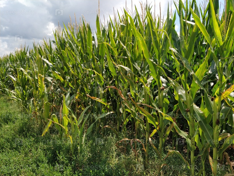 Кукурузное поле и небо с облаками. Высокие зеленые растения, стебли и листья, початки кукурузы