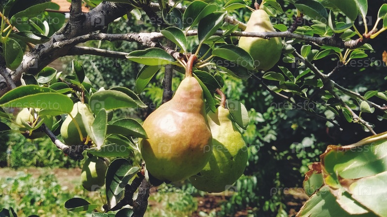 Груши на ветке. Несколько фруктовых фруктов, готовых к сбору и употреблению. Садовые растения. Спелая груша в саду или на ферме