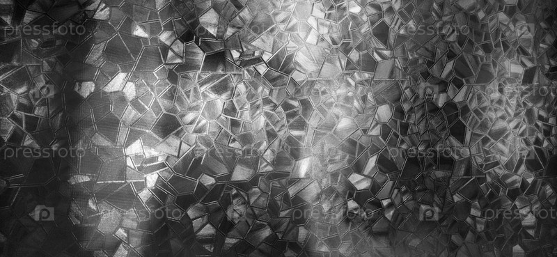 Рельефный стеклянный фон. Монохромное рифленое стекло. Преломление света на неровной прозрачной поверхности при контровом свете. Игра белых и серых бликов. Черные области. Абстрактный фон