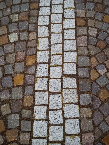 Тротуар в центре старого города, выложенный квадратными полированными камнями. Уличная плитка в мягких бежевых, желтых и серых тонах