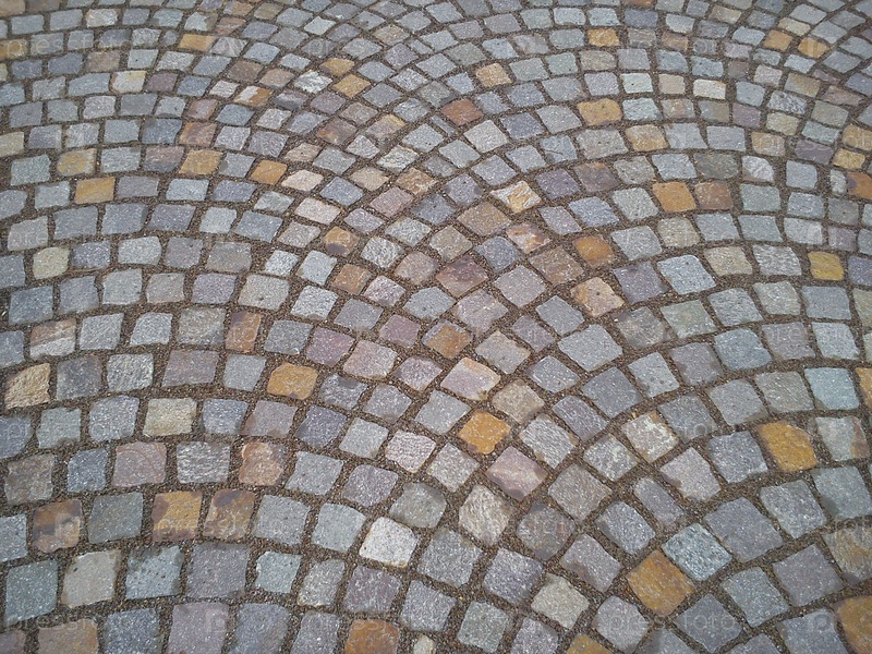 Старая брусчатка на городской площади. Серые и бежевые камни. Полукруги и закругленные линии