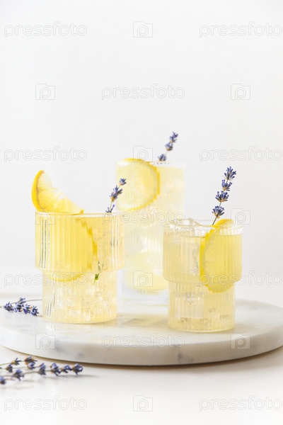 Игристый летний лавандовый лимонад в очках на сером фоне. Вертикальный формат. Закрыть. Летние напитки для вечеринки