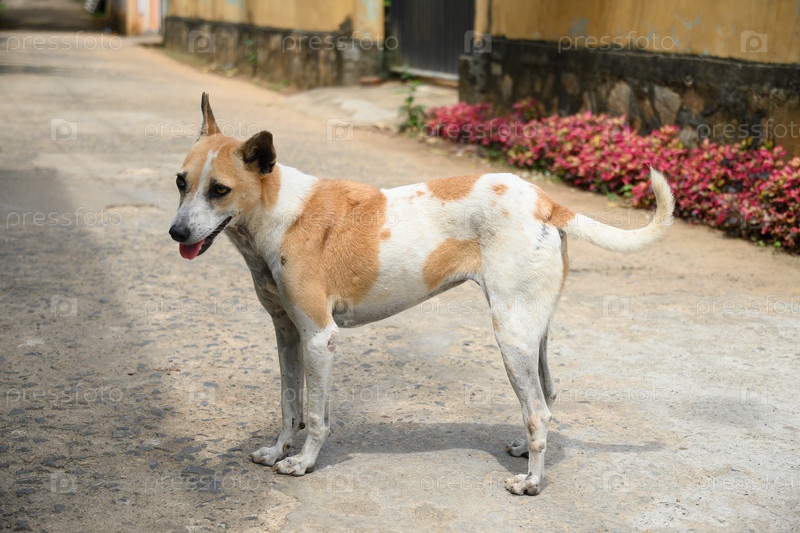 Голодная бездомная собака ходит по азиатской улице в поисках еды. Шри-Ланка