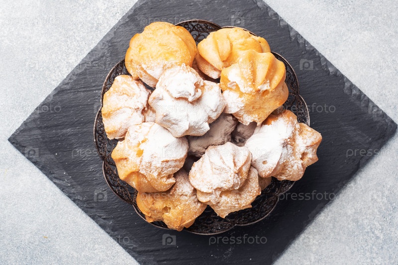 Профитроли с заварным кремом и сахарной пудрой на тарелке. Бетонный серый стол. Скопируйте пространство