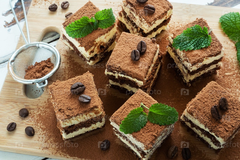 Кусочки торта тирамису с нежным кремом, кофейными зернами и листьями мяты