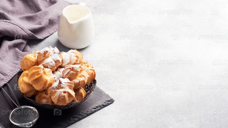 Профитроли с заварным кремом и сахарной пудрой на тарелке. Бетонный серый стол. Скопируйте пространство