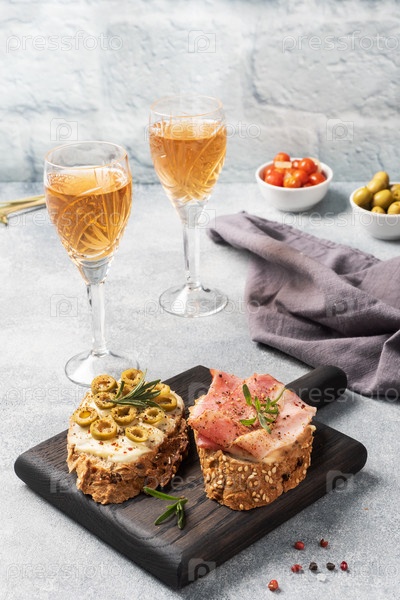 Бутерброды из цельнозернового хлеба со сливочным сыром, беконом и оливками на деревянной разделочной доске. Бокал белого вина. Серый бетонный фон с копировальным пространством