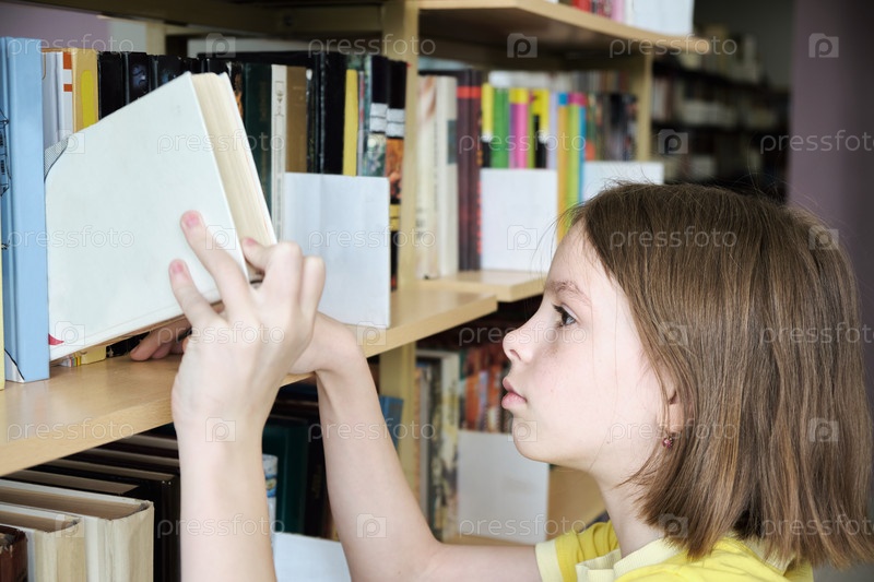 Школьница выбирает книгу в школьной библиотеке. Обратно в школу