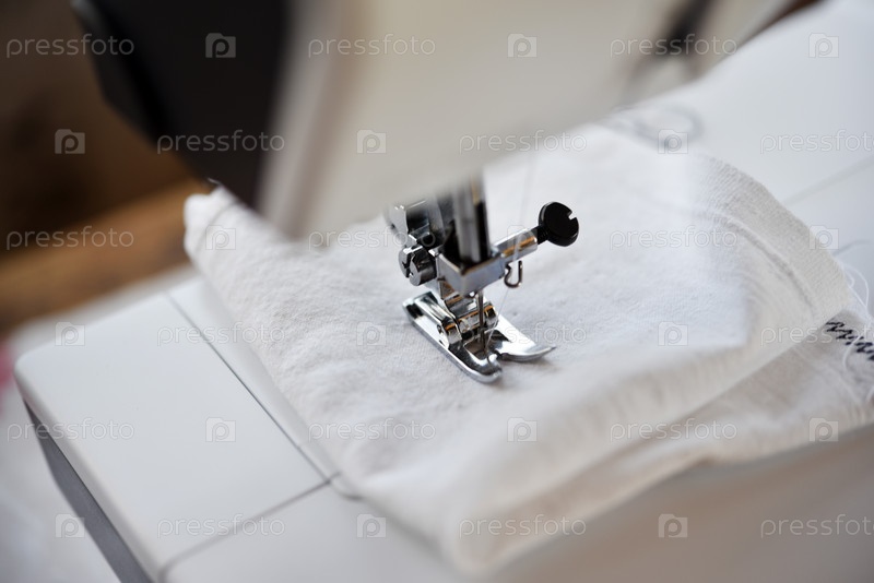 Белая швейная машинка в комнате. Обработка одежды на швейной машине
