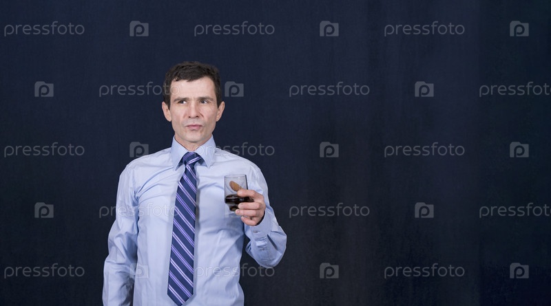 Молодой и трезвый мужчина в голубой рубашке и галстуке стоит на темном фоне. В руке он держит бокал с вином. Дегустация алкогольного напитка