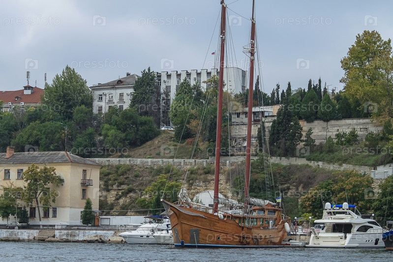 Деревянная парусная яхта с высокой мачтой стоит в порту. Рядом находятся быстроходные яхты. На заднем плане старые здания, голубое небо и деревья