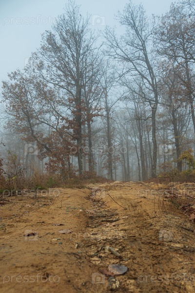 Туманное утро в осеннем лесу. Грязная коричневая дорога на фоне голых деревьев в тумане. Красивый загадочный осенний пейзаж