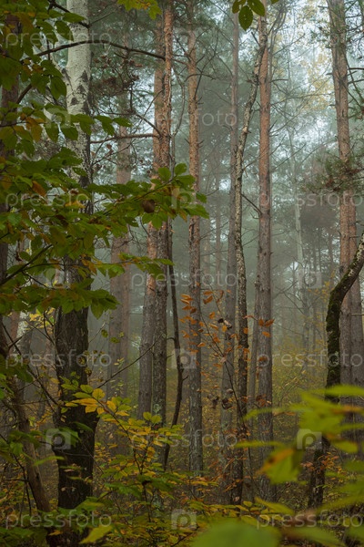 Туманное утро в сосновом лесу. Гладкие стволы сосен и желто-зеленые листья деревьев в тумане. Красивый, загадочный осенний пейзаж