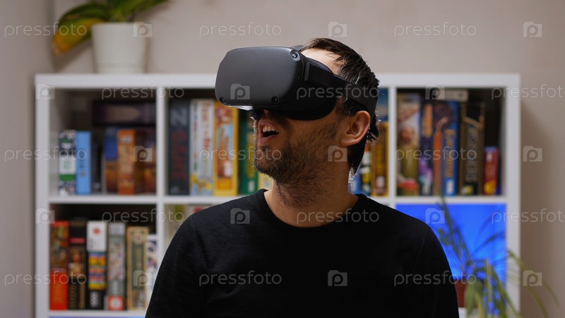 Бородатый мужчина с удивленно открытым ртом стоит в комнате в очках виртуальной реальности. На заднем плане стойка с настольными играми. Шлем виртуальной реальности для развлечений, обучения и игр