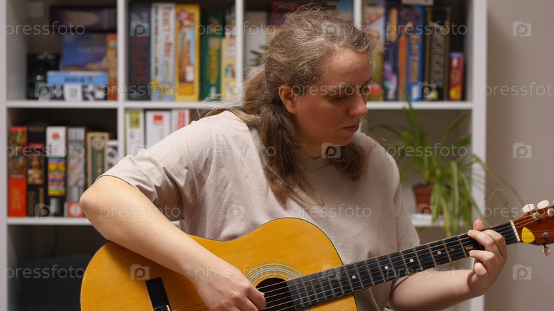 Девушка играет на акустической гитаре, сидя в комнате. За ней стойка с настольными играми и цветами. Мешан из музыки