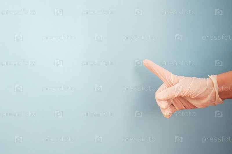 Рука в латексной перчатке с указательным пальцем номер один на синем фоне. Скопируйте пространство