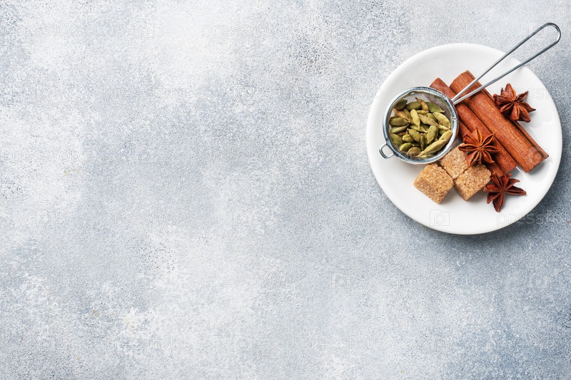 Цельные зерна кардамона, палочка корицы, звездчатый анис и тростниковый сахар. Скопируйте пространство. Ингредиенты для приготовления индийского напитка масала чай