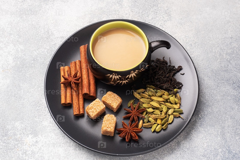 Индийцы пьют чай масала с молоком и специями. Палочки кардамона, корицы, звездчатого аниса, тростникового сахара. Бетонное серое пространство для копирования стола