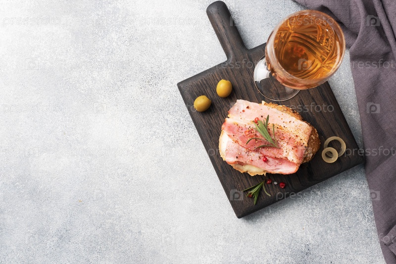 Бутерброды из цельнозернового хлеба со сливочным сыром, беконом на деревянной разделочной доске. Серый бетонный фон Скопируйте пространства