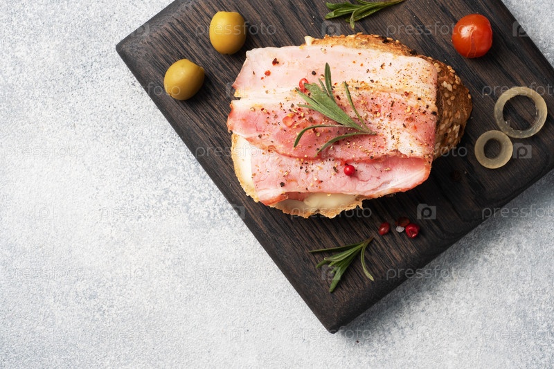 Бутерброды из цельнозернового хлеба со сливочным сыром, беконом на деревянной разделочной доске. Серый бетонный фон Скопируйте пространства