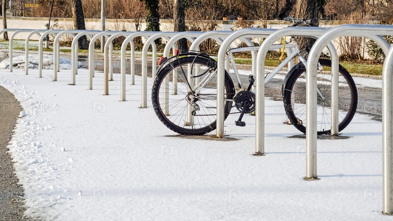 Велосипед припаркован на пустой стоянке для уличных велосипедов, засыпанной первым снегом
